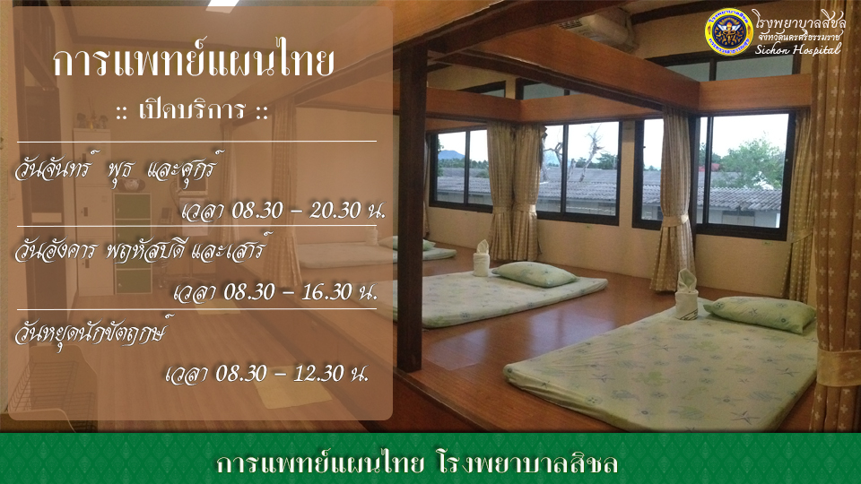 แพทย์แผนไทยให้บริการตรวจ วินิจฉัย รักษา ฟื้นฟูสภาพ ส่งเสริมและป้องกันโรคด้วยศาสตร์การแพทย์แผนไทย และมีผู้ป่วยชแพทย์แผนไทย (ด้านการนวด) ที่ผ่านการอบรม 330 ชั่วโมง